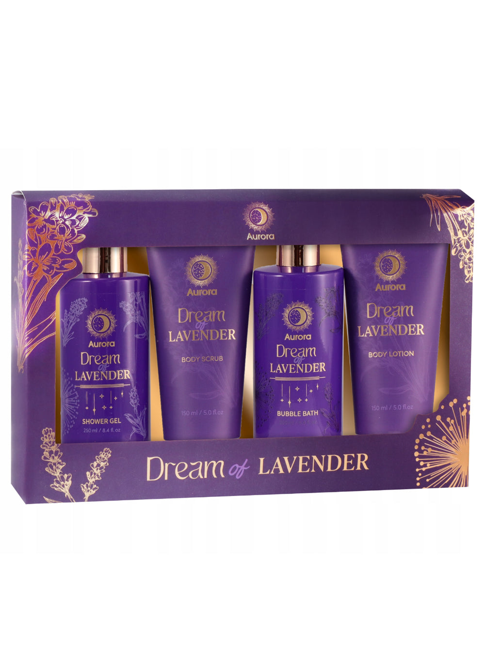 Aurora Dream of Lavender to zestaw stworzony z myślą o osobach, które cenią chwile wyciszenia i domowe rytuały pielęgnacyjne. Lawendowy zapach pomaga się odprężyć, a starannie dobrane kosmetyki zamieniają zwykłą kąpiel w relaksujące doświadczenie.