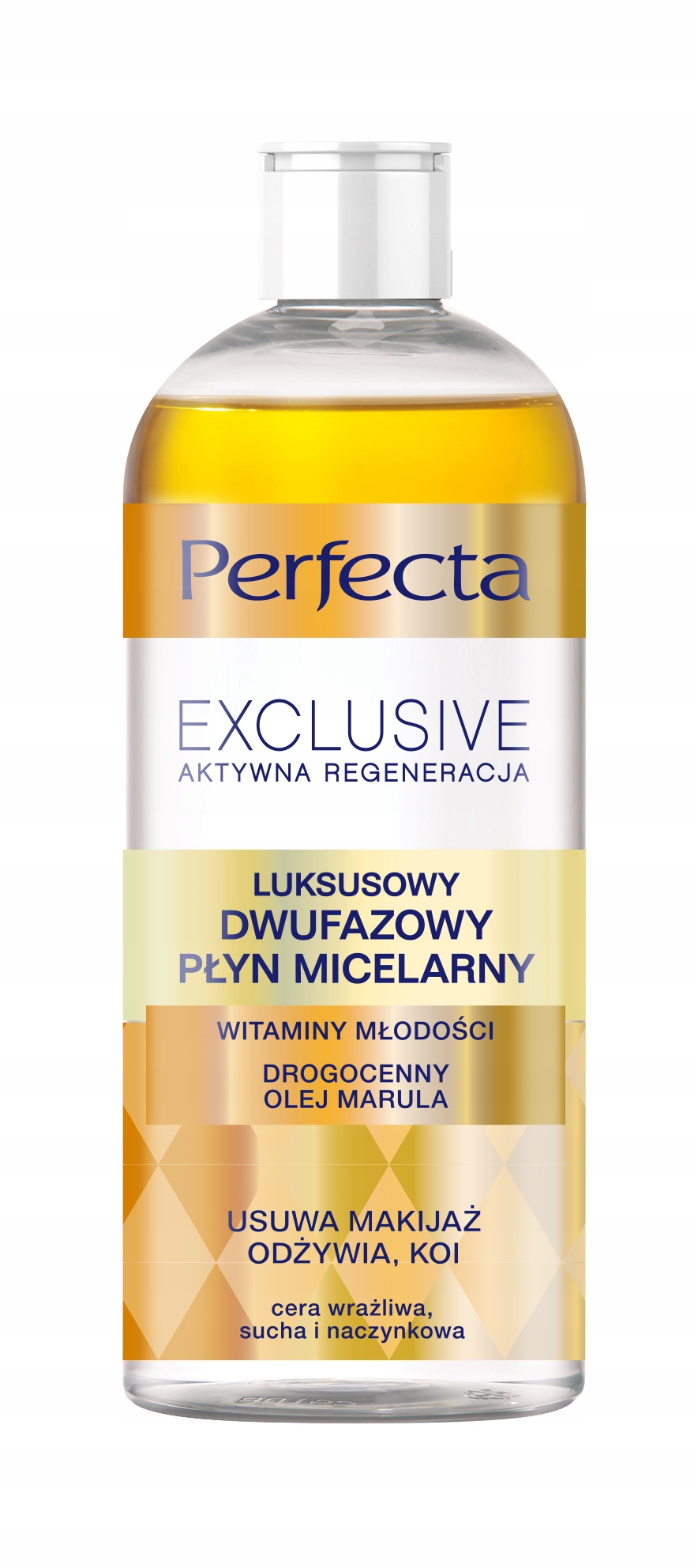 Dwufazowa formuła – skuteczny demakijaż w kilka sekund PERFECTA Exclusive to dwufazowy płyn micelarny, który skutecznie usuwa nawet wodoodporny makijaż. Dzięki unikalnemu połączeniu fazy olejowej i micelarnej, produkt doskonale radzi sobie z zanieczyszczeniami, pozostawiając skórę czystą i odświeżoną. Koniec z uporczywym pocieraniem – wystarczy kilka ruchów, aby cieszyć się idealnie czystą cerą!